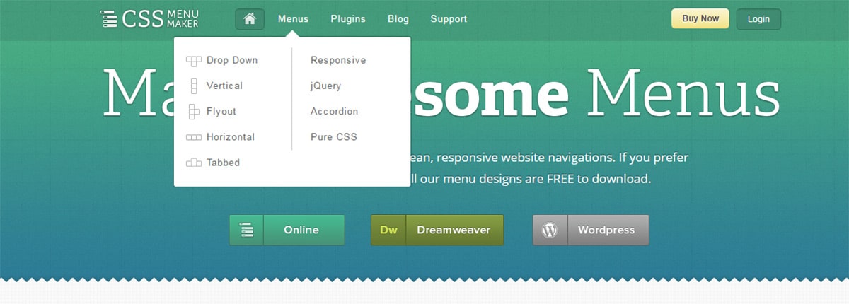 Take a peek at the ESPN top navigation. You can hover any sports division to get a dropdown menu of teams and related links. This dropdown clearly slides into view from top to bottom. However it does this quickly so you’re not stuck waiting 2-3 seconds before you can interact with the links. Generally I recommend keeping menu animations at 1.5 seconds or less. This rule of thumb only applies to menu animations because they’re interactive elements. But you can easily extend animations for other page items up to 3-5 seconds(or more) if it makes sense. Ironically the CSS MenuMaker website has a stunning top menu design. The dropdowns have callout arrows like speech bubbles to denote which primary link it belongs to.